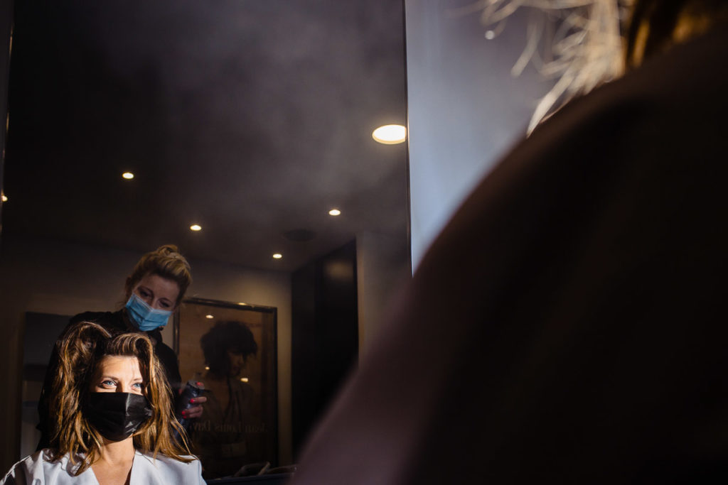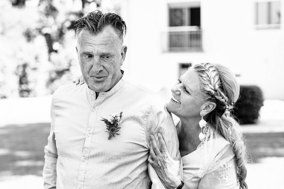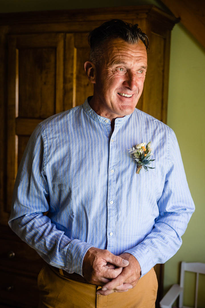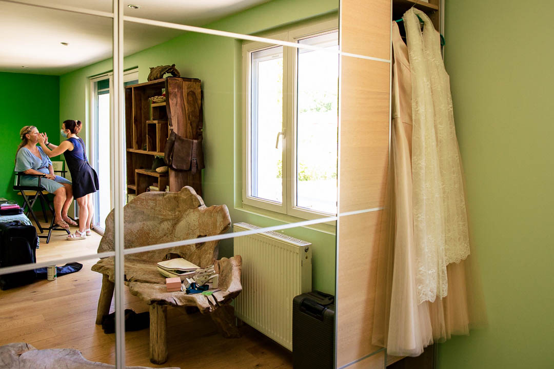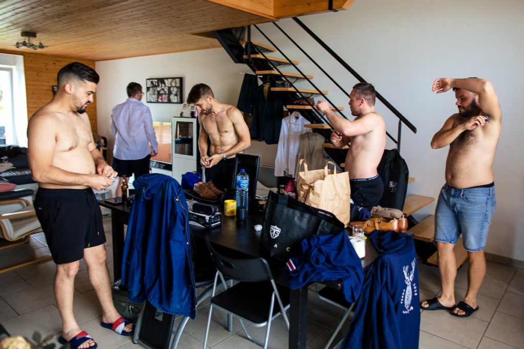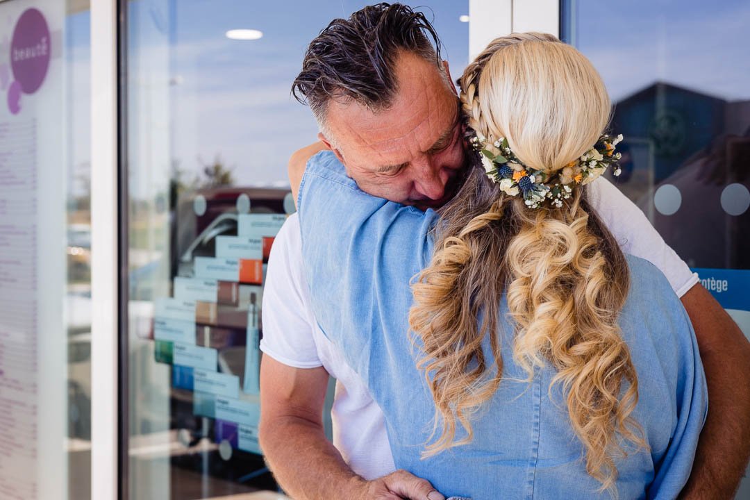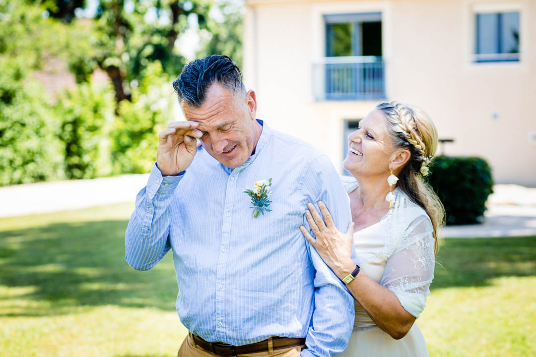Les préparatifs ont tout d’abord commencé chez le coiffeur, puis chez Franck, à Clenay, un petit village à proximité de Dijon. C’est dans leur jardin qu’ils se sont découverts en tenue de mariés : forte émotion pour Franck, moment touchant que de voir ce grand gaillard aussi ému.