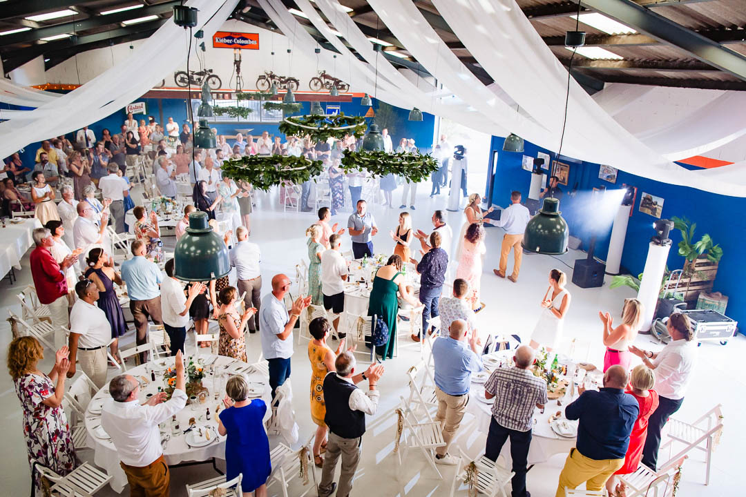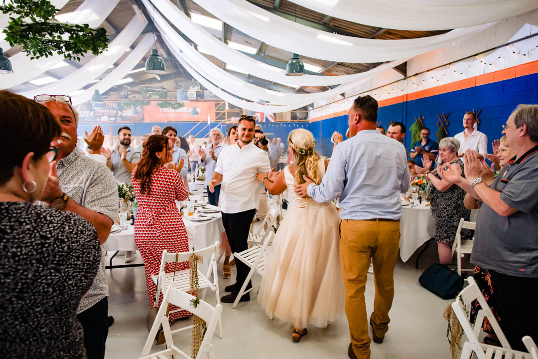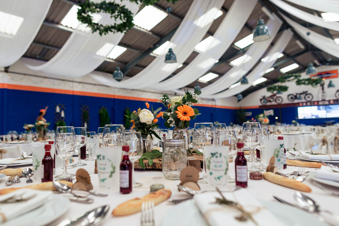 Comme les deux mariés sont fans de 4×4 et de camion, il était logique que la réception du mariage se déroule dans leur garage automobile : c’est sur un parking entouré de 4×4 de collection, de leur fidèle Range Classic de voyage, de leur prototype Defender de course et de nombreux camions que la réception à eu lieu, avant une entrée en salle assez épique (surtout pour Winch) dans leur atelier, décoré avec goût, dans une esthétique qui laissait la part belle à la mécanique automobile.