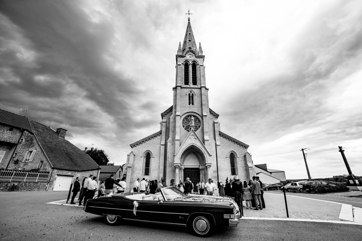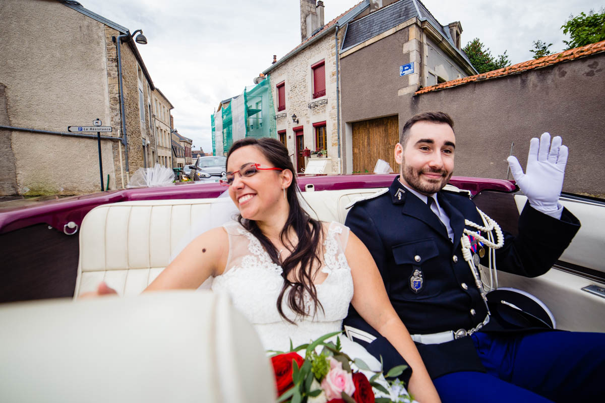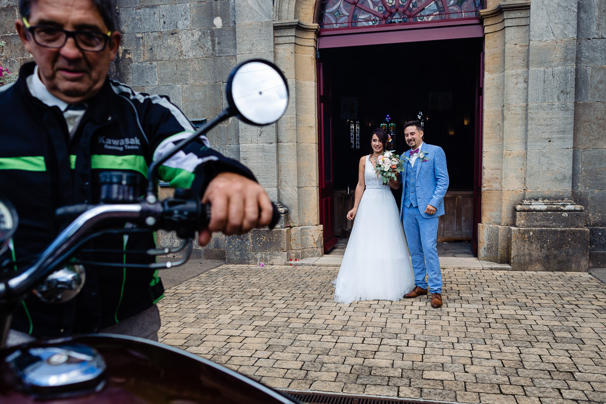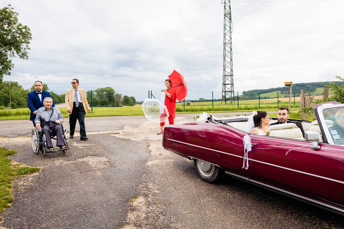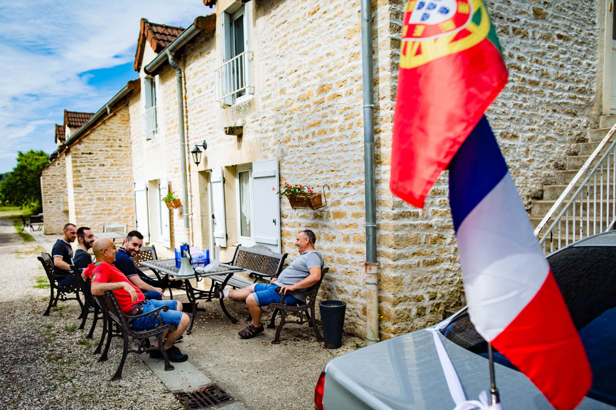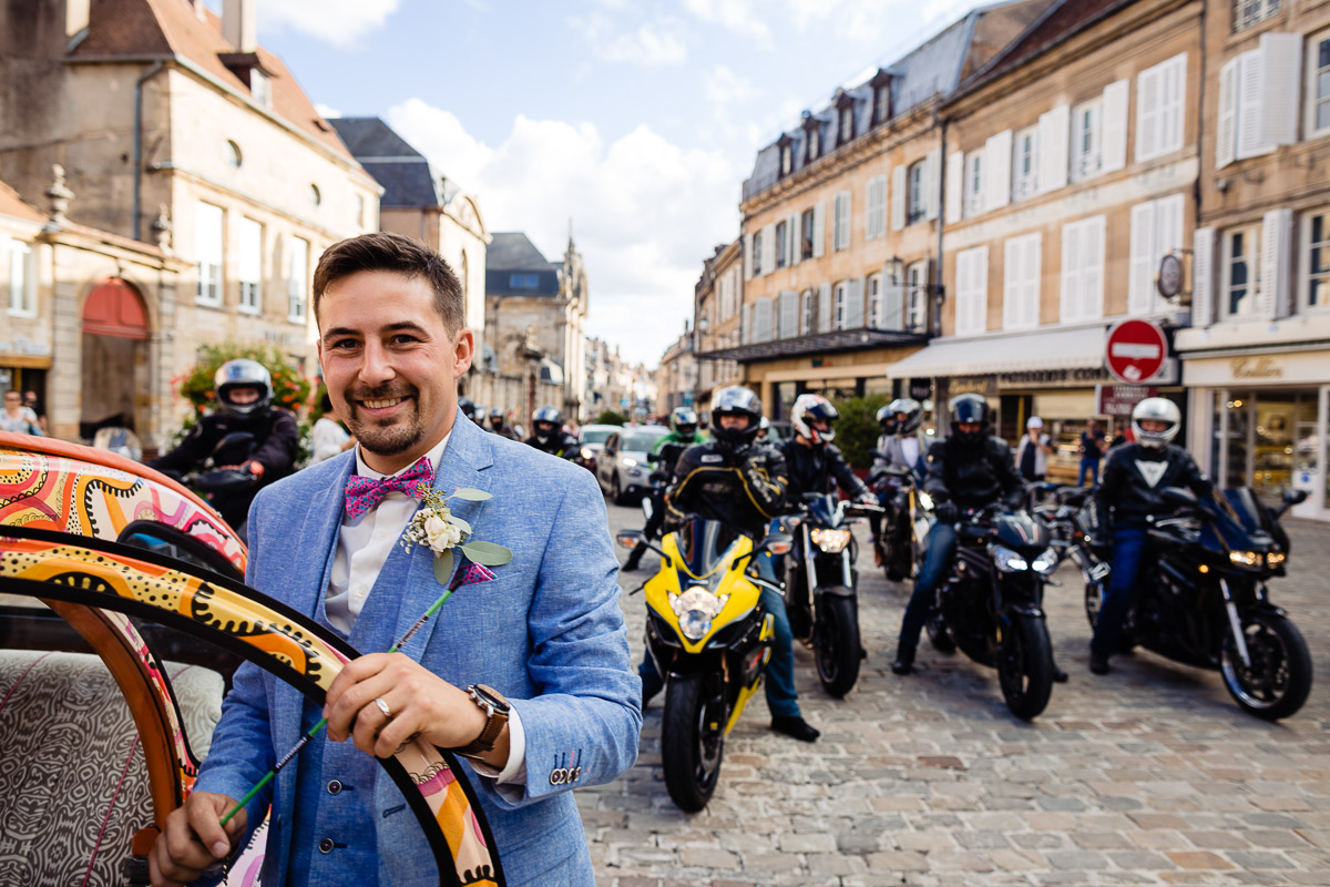 Le trajet s’est déroulé en 2CV colorée jusqu’à l’église de Chalindrey, où j’ai retrouvé le prêtre génial du mariage d’Océane et Clément. La sortie de l’église était épique, avec la surprise de la haie d’honneur de motos, un moment très émouvant pour Ghislain, motard lui-même (bravo à Louis pour l’orga !). Avant de se retrouver à la fameuse ferme Sainte-Anne, le cortège a fait un arrêt à l’iconique place Diderot, pour un concert de motos devant la statue éponyme.