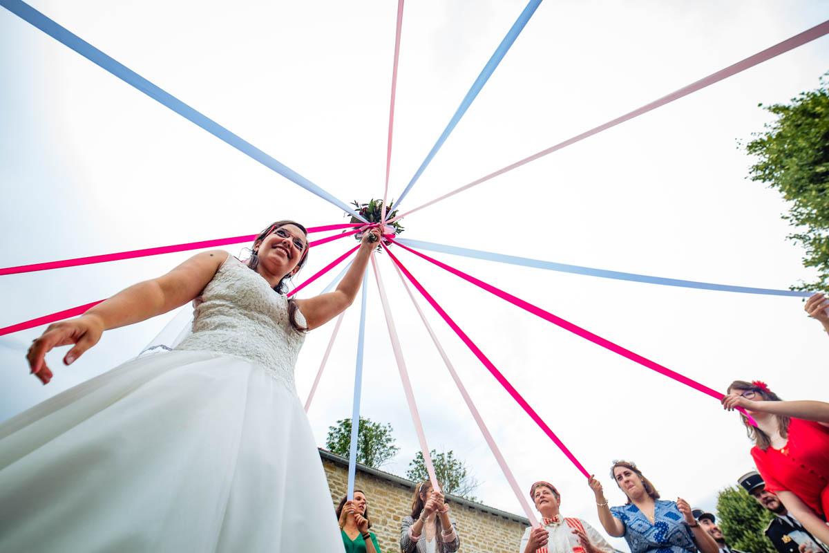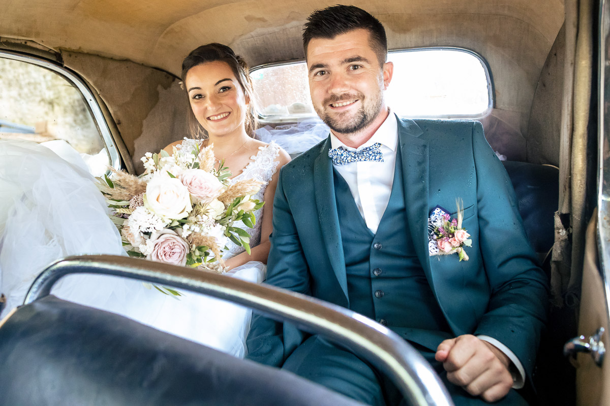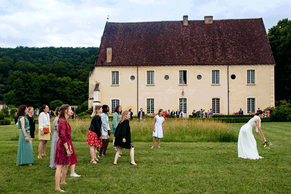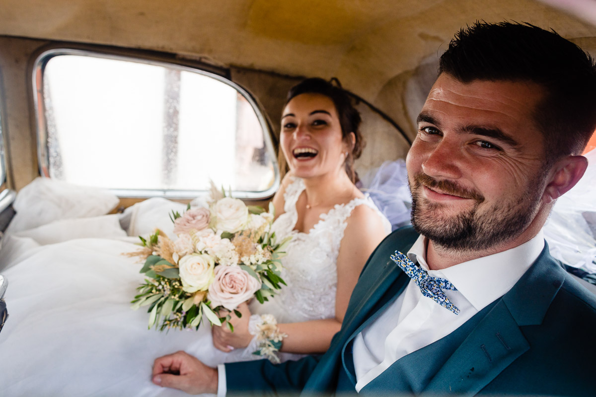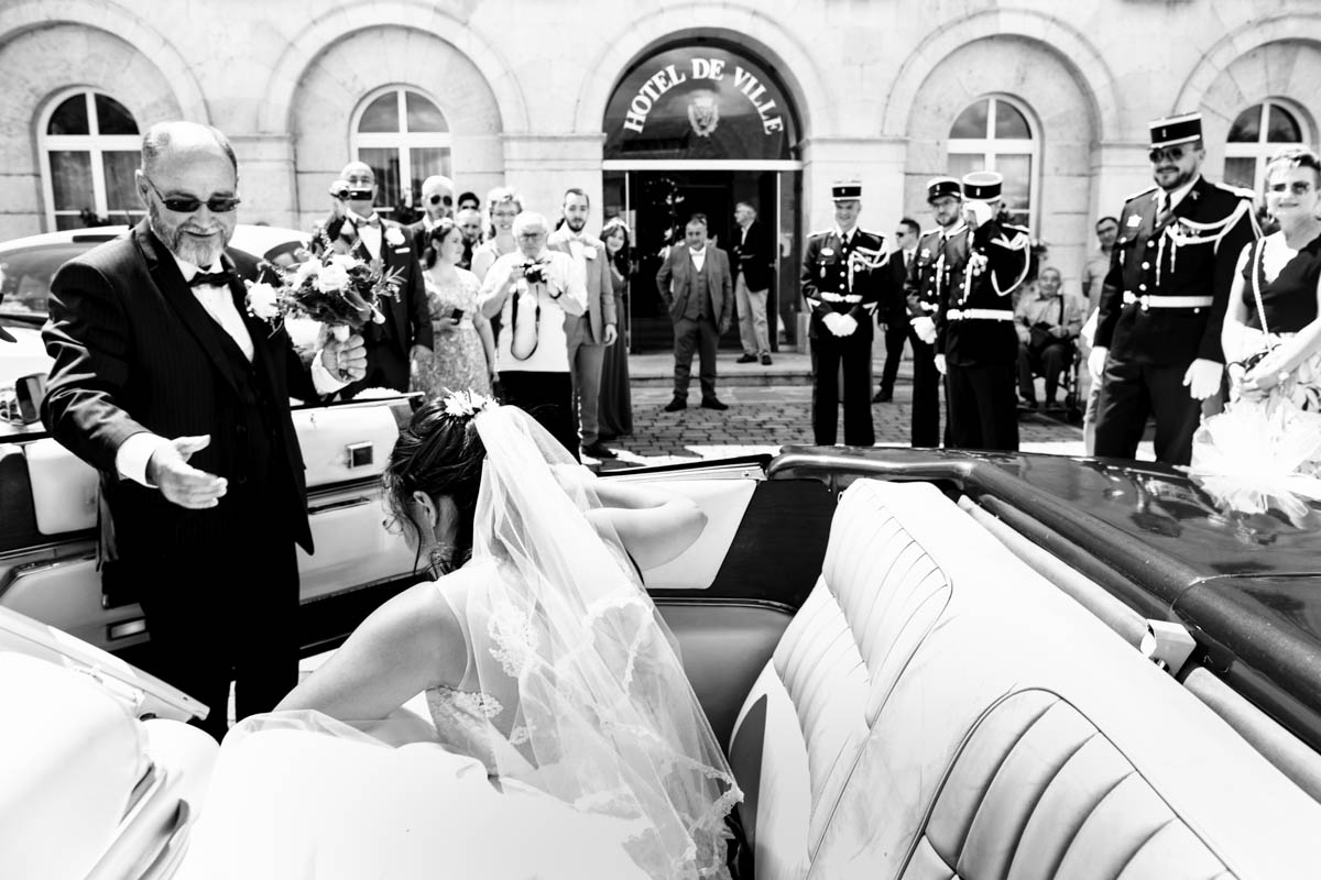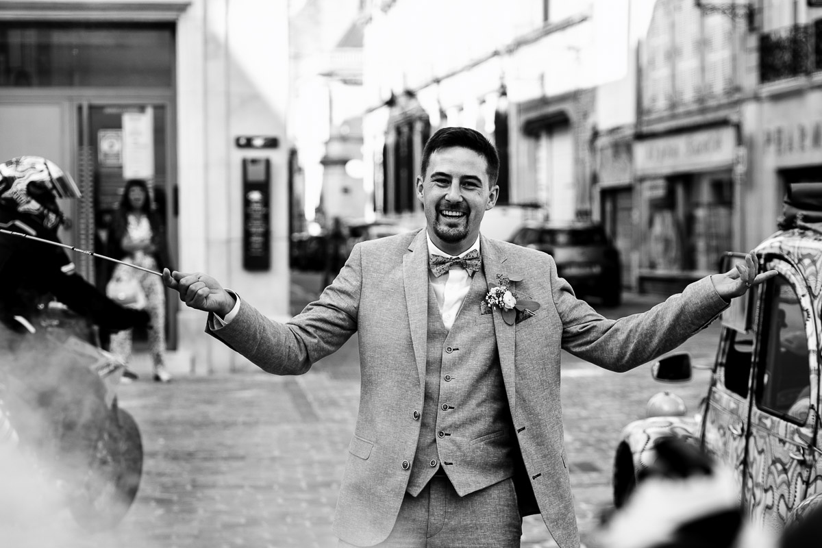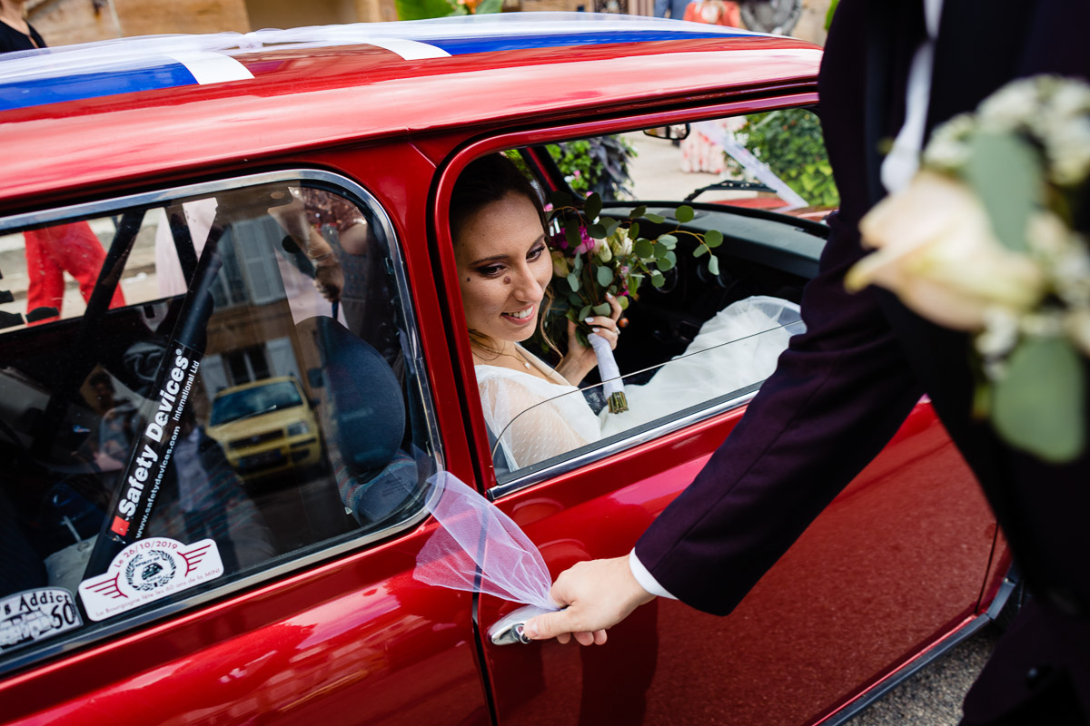 Le trajet s’est déroulé en 2CV colorée jusqu’à l’église de Chalindrey, où j’ai retrouvé le prêtre génial du mariage d’Océane et Clément. La sortie de l’église était épique, avec la surprise de la haie d’honneur de motos, un moment très émouvant pour Ghislain, motard lui-même (bravo à Louis pour l’orga !). Avant de se retrouver à la fameuse ferme Sainte-Anne, le cortège a fait un arrêt à l’iconique place Diderot, pour un concert de motos devant la statue éponyme.