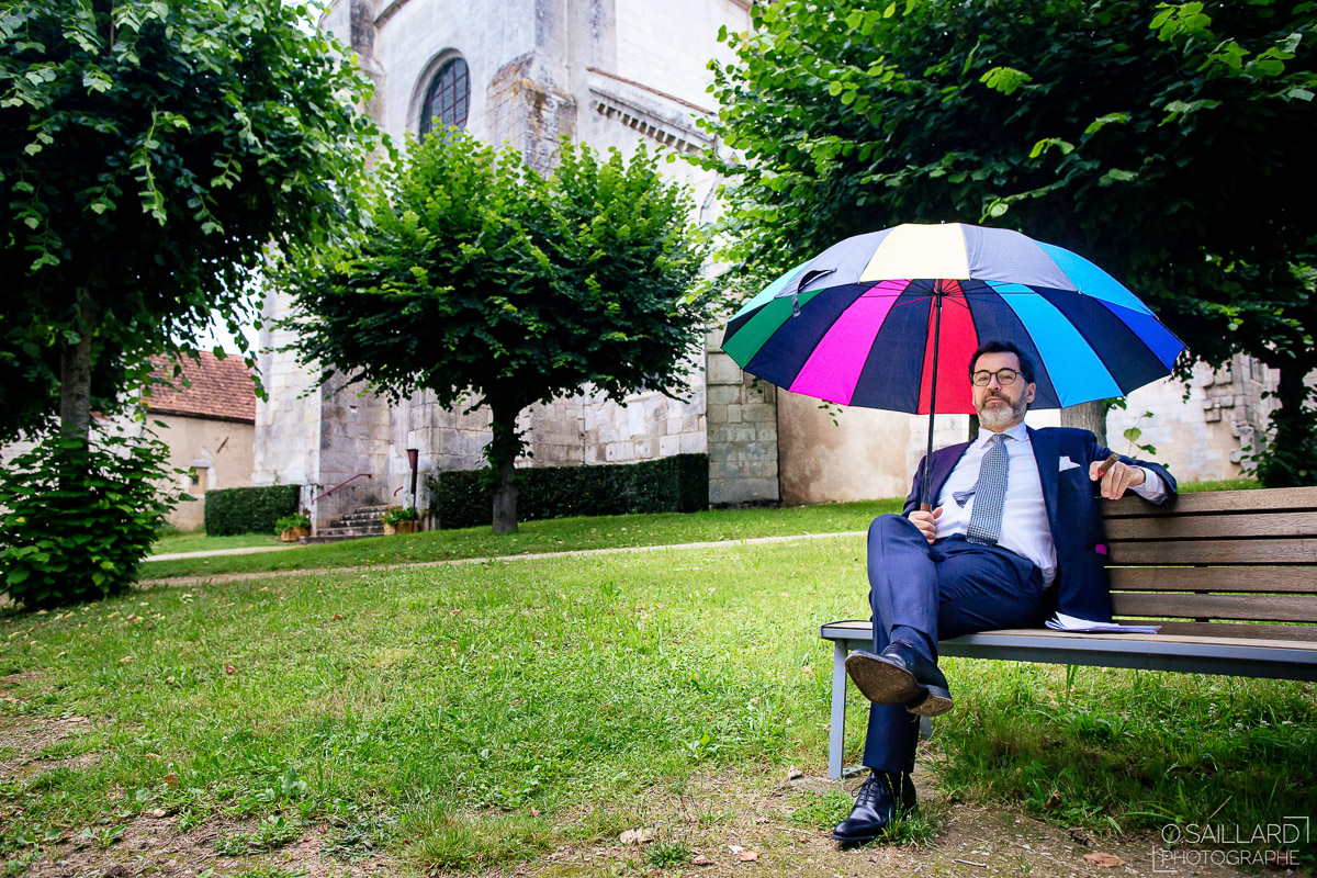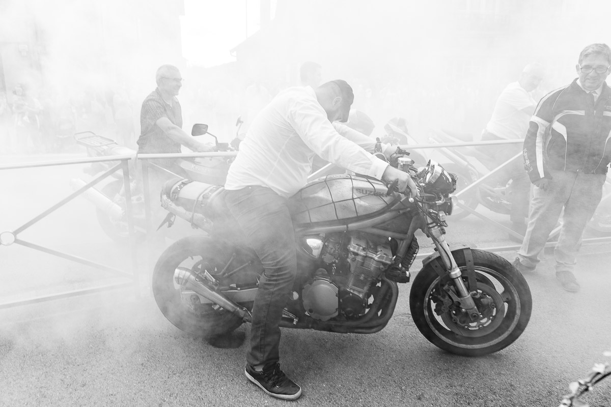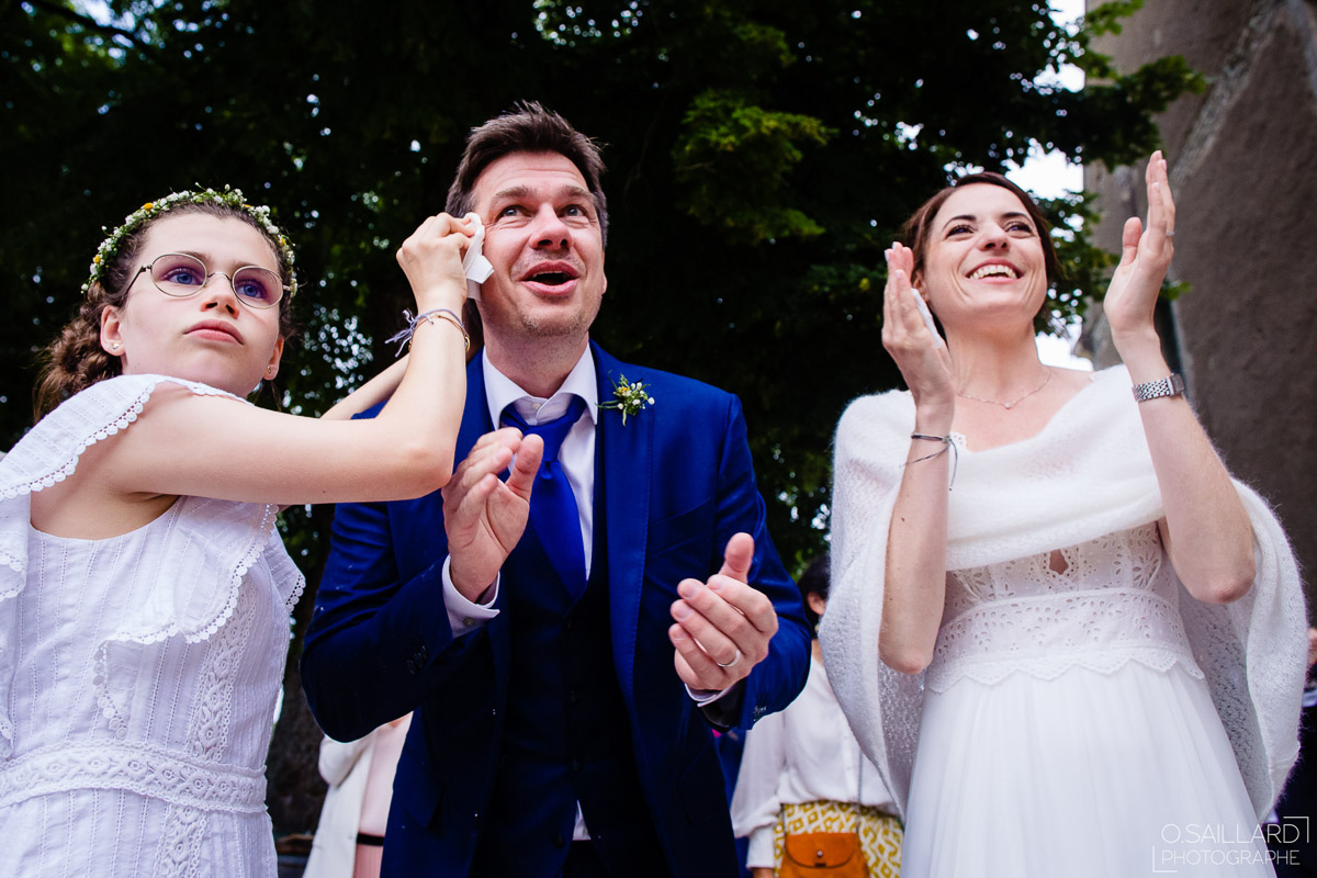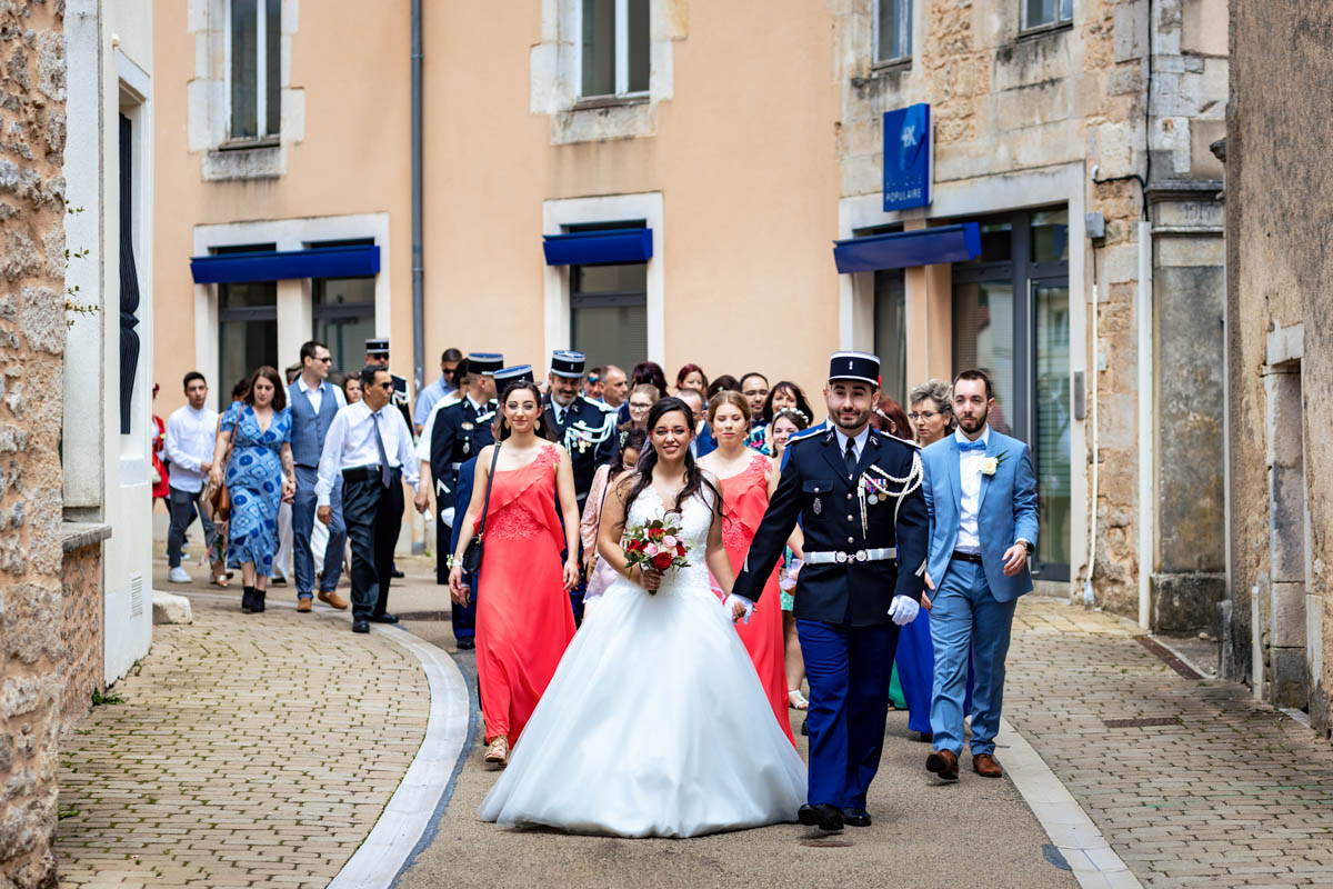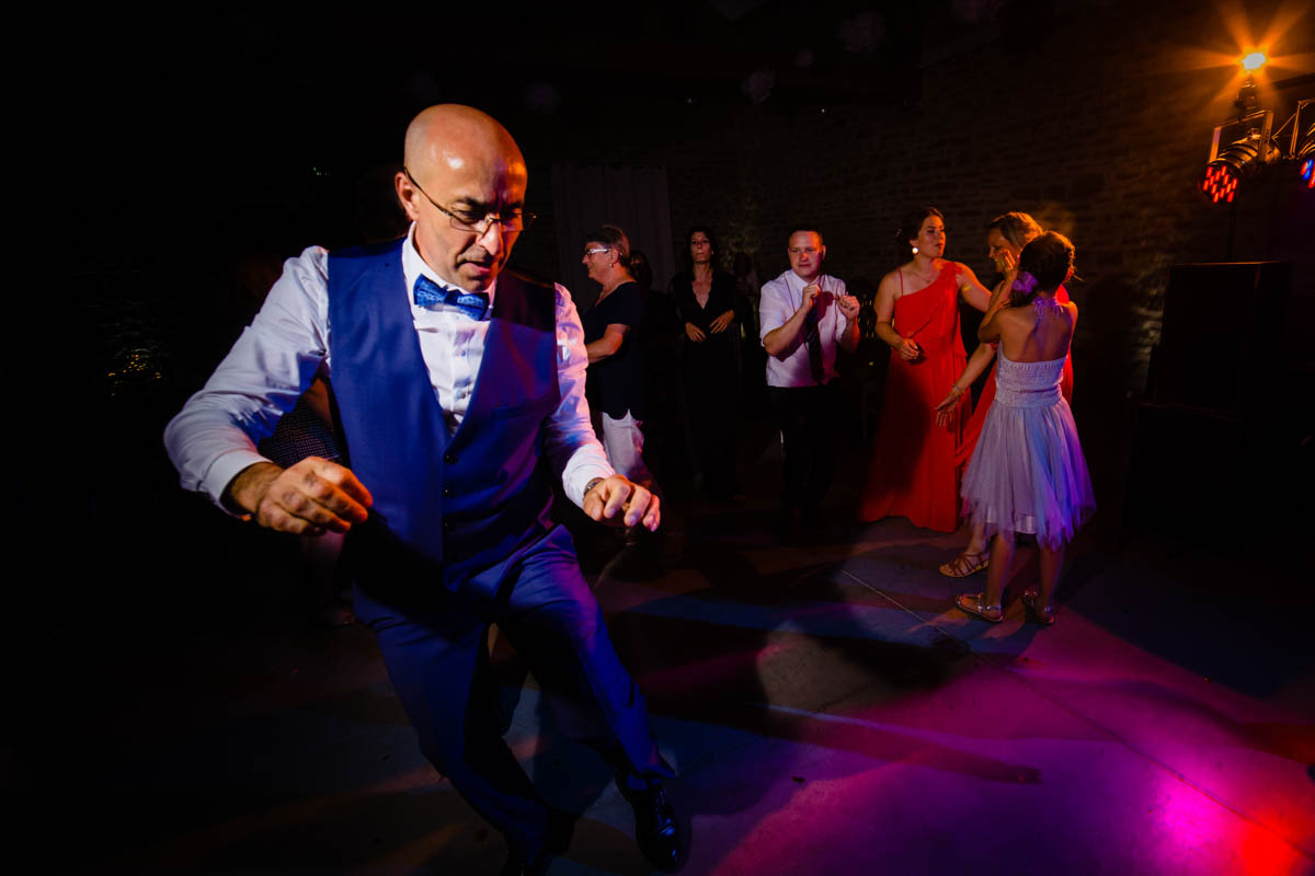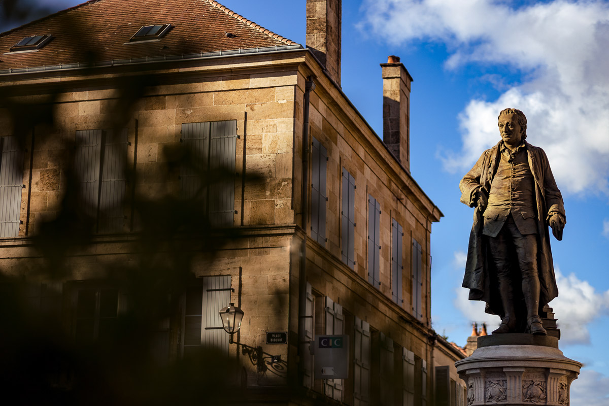Le trajet s’est déroulé en 2CV colorée jusqu’à l’église de Chalindrey, où j’ai retrouvé le prêtre génial du mariage d’Océane et Clément. La sortie de l’église était épique, avec la surprise de la haie d’honneur de motos, un moment très émouvant pour Ghislain, motard lui-même (bravo à Louis pour l’orga !). Avant de se retrouver à la fameuse ferme Sainte-Anne, le cortège a fait un arrêt à l’iconique place Diderot, pour un concert de motos devant la statue éponyme.