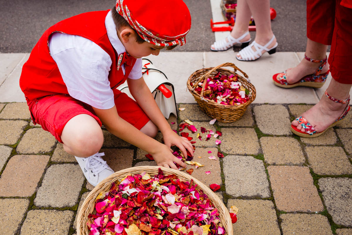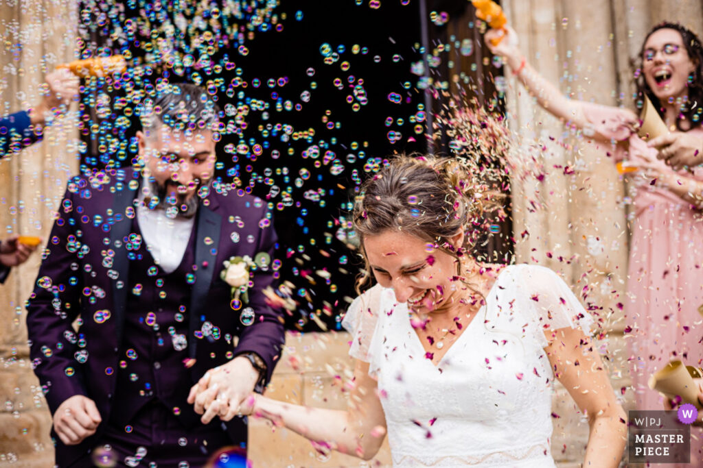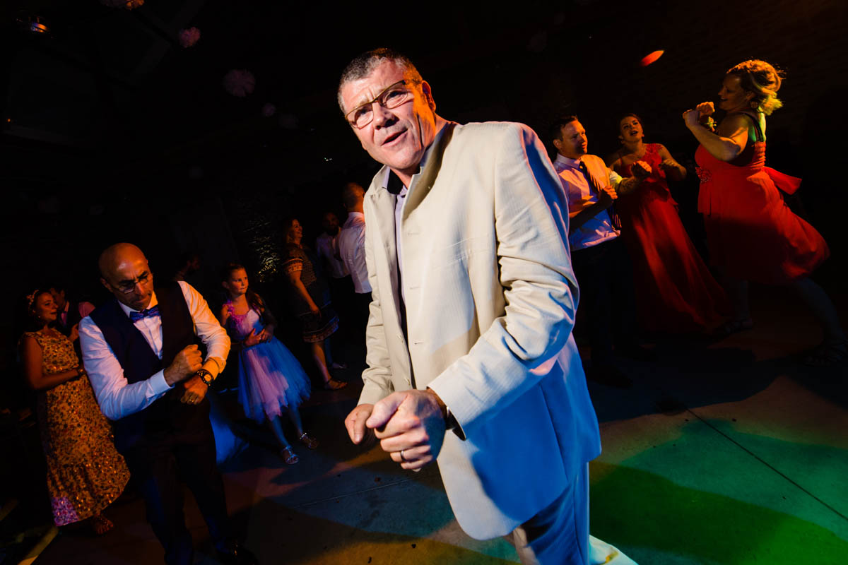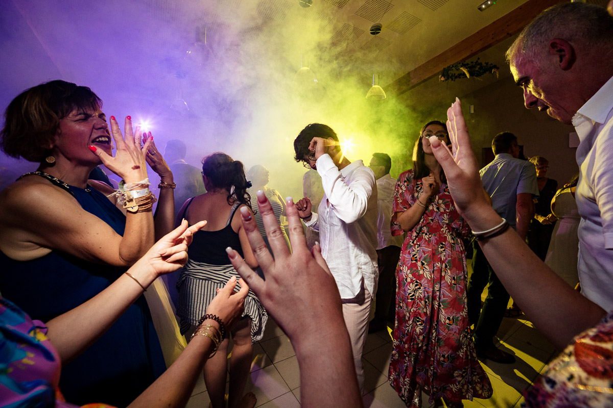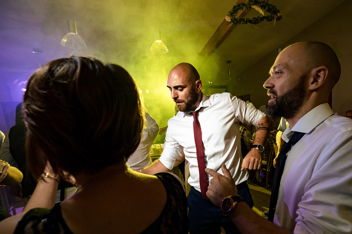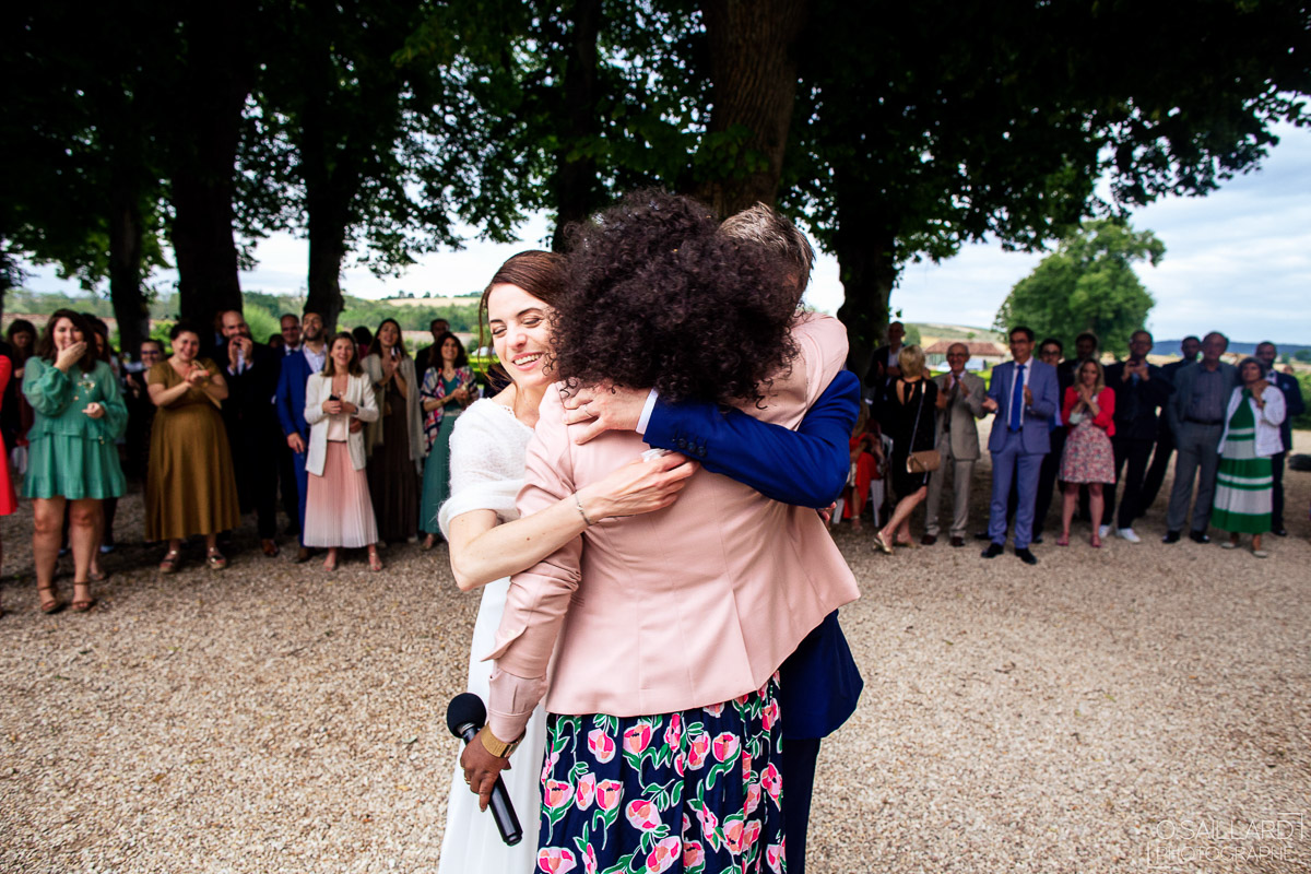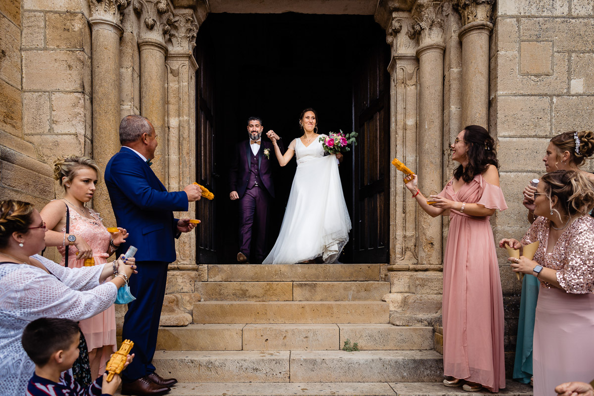 Le trajet s’est déroulé en 2CV colorée jusqu’à l’église de Chalindrey, où j’ai retrouvé le prêtre génial du mariage d’Océane et Clément. La sortie de l’église était épique, avec la surprise de la haie d’honneur de motos, un moment très émouvant pour Ghislain, motard lui-même (bravo à Louis pour l’orga !). Avant de se retrouver à la fameuse ferme Sainte-Anne, le cortège a fait un arrêt à l’iconique place Diderot, pour un concert de motos devant la statue éponyme.