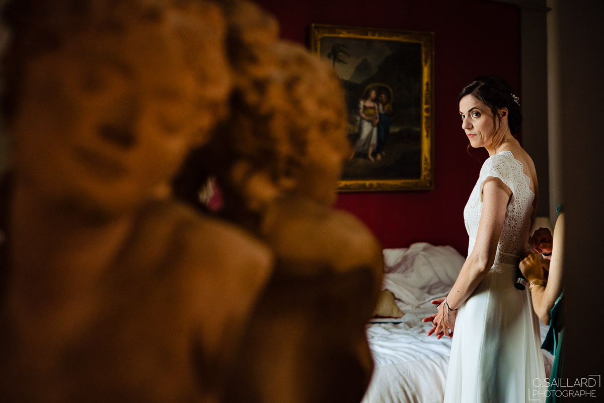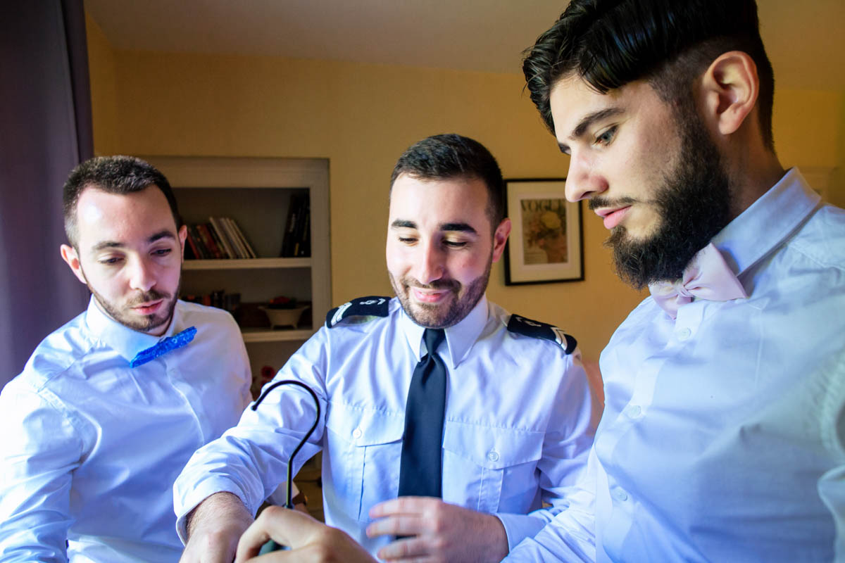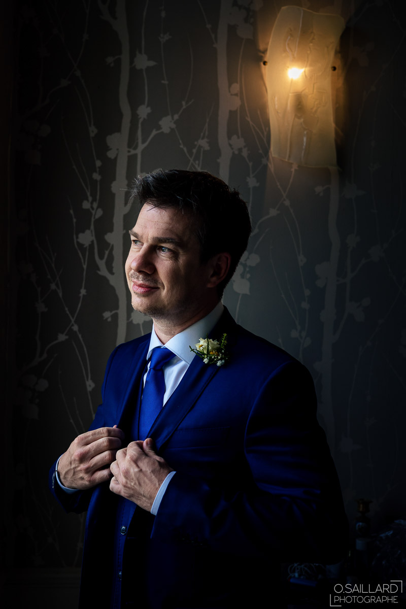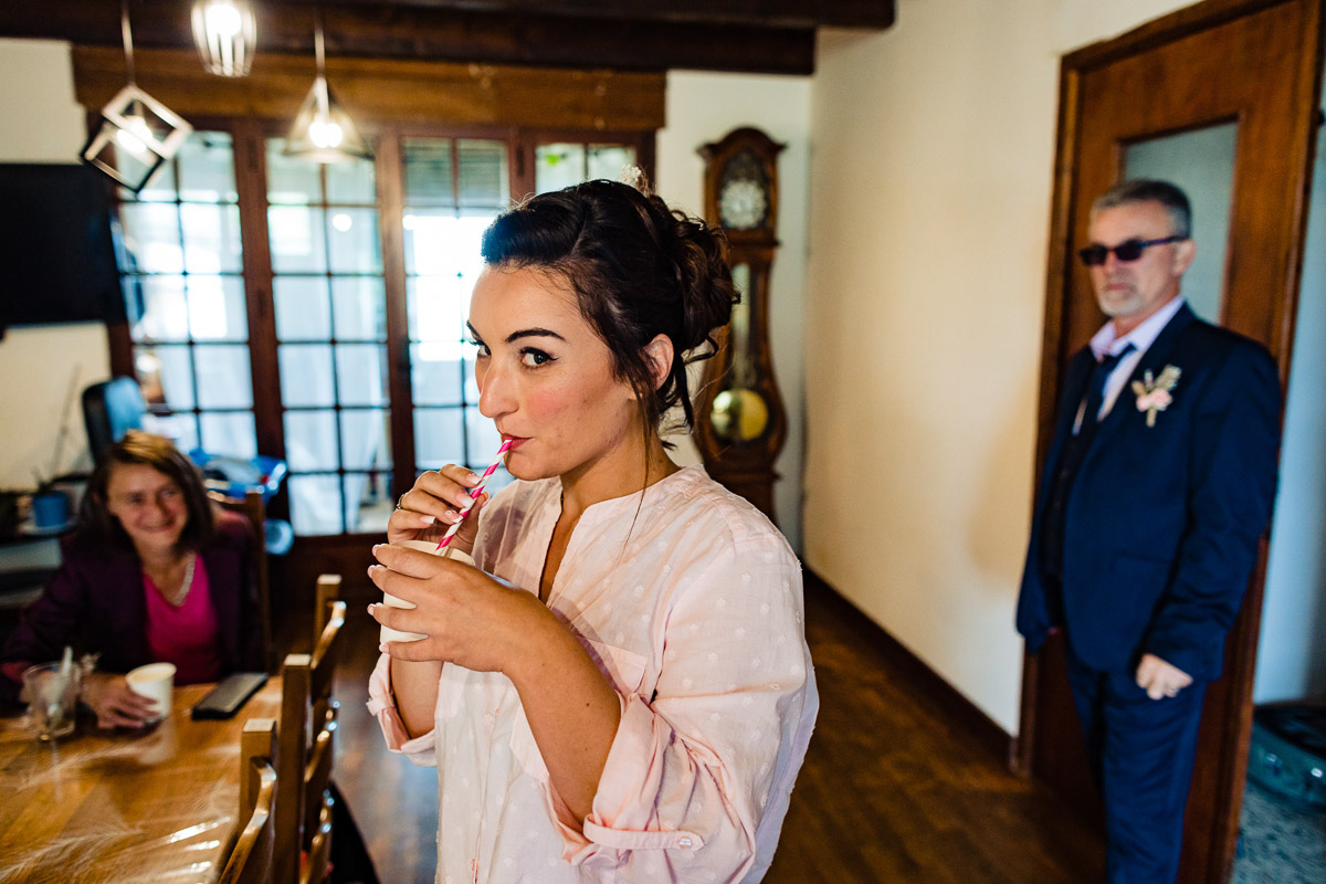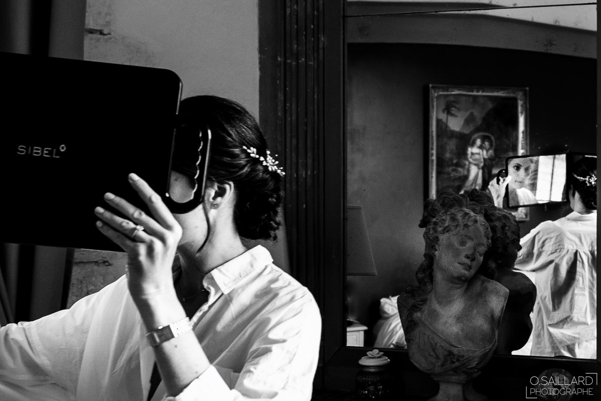 Les préparatifs d’Amélie ont eu lieu avec sœurs et amies dans la maison qu’elle partage avec Ghislain, pendant que le marié se préparait chez ses parents, à une rue de chez moi. Après s’être habillé avec ses témoins, nous avons eu quelques minutes pour des photos sur remparts de Langres, la maison les jouxtant.