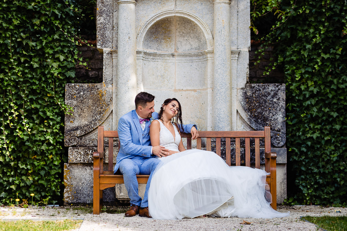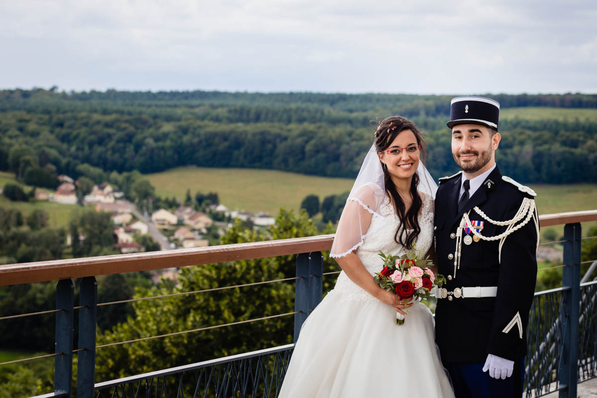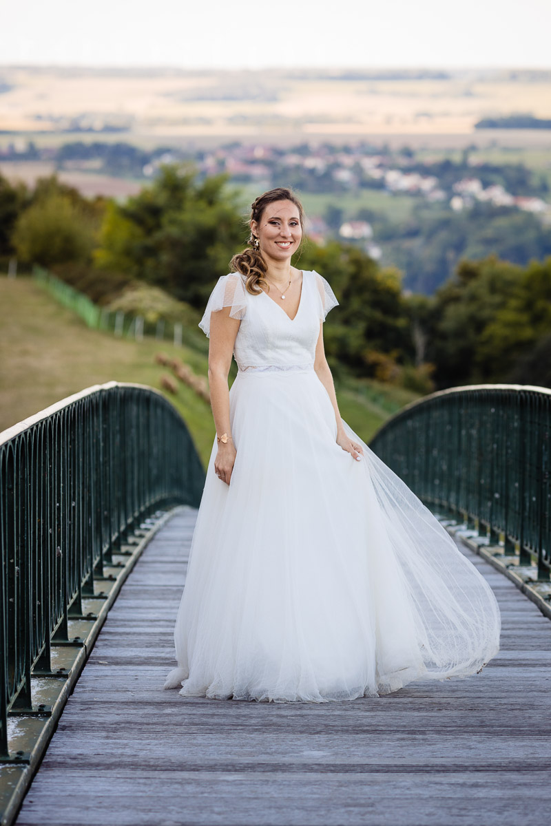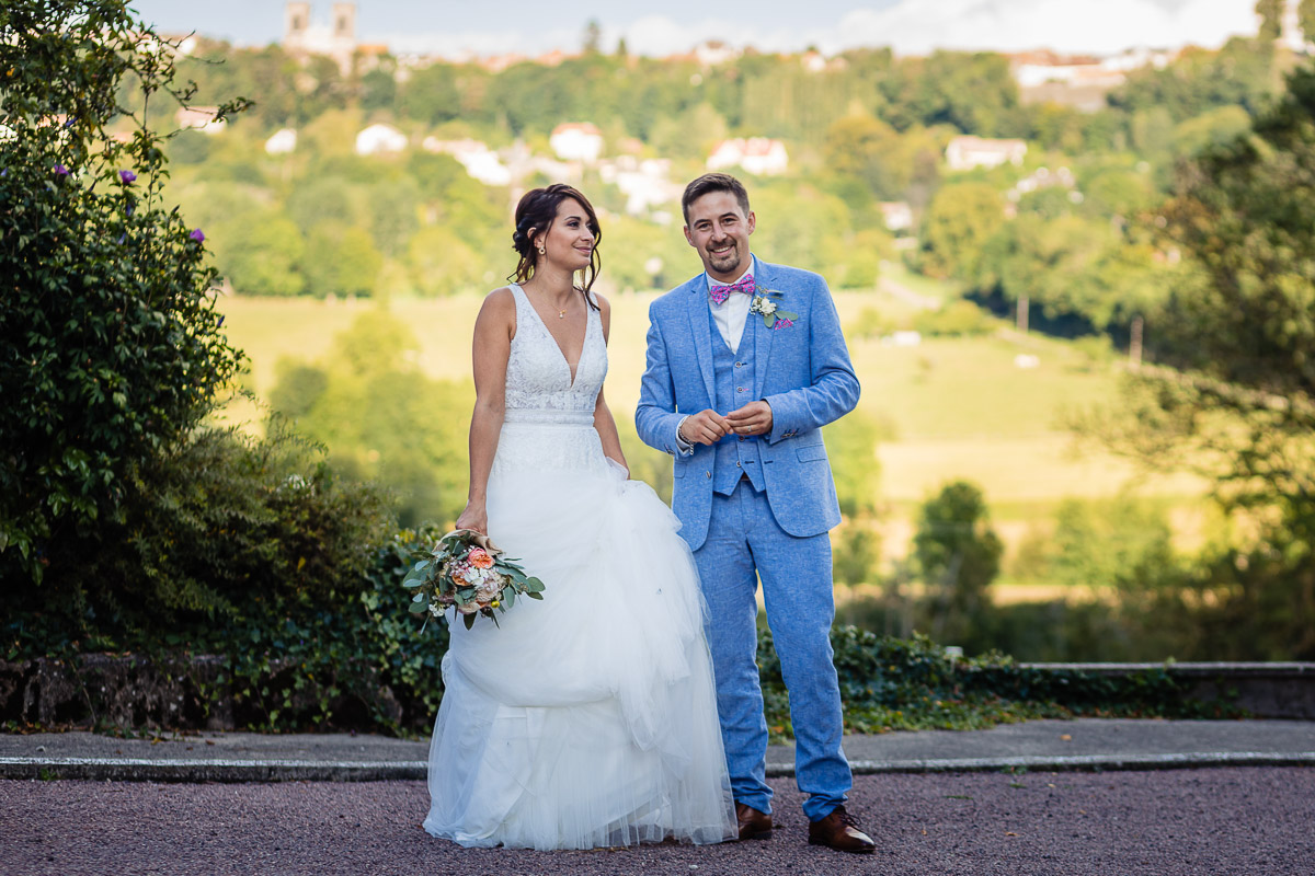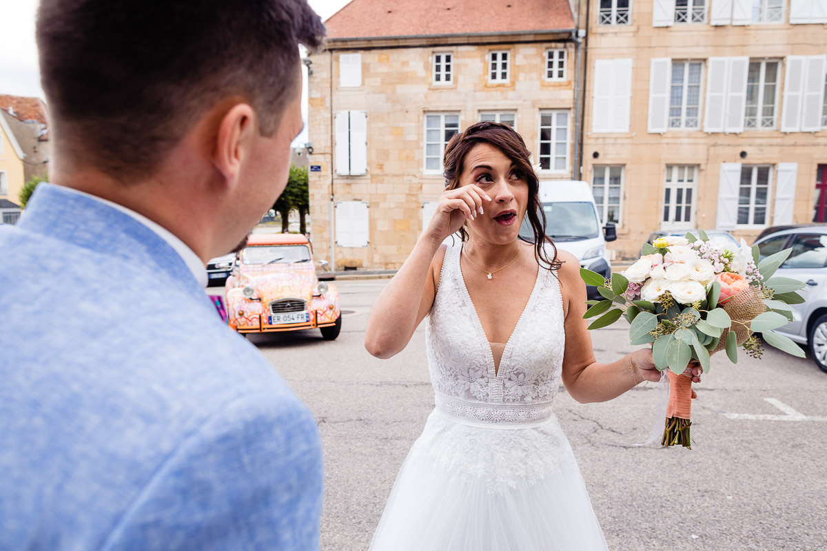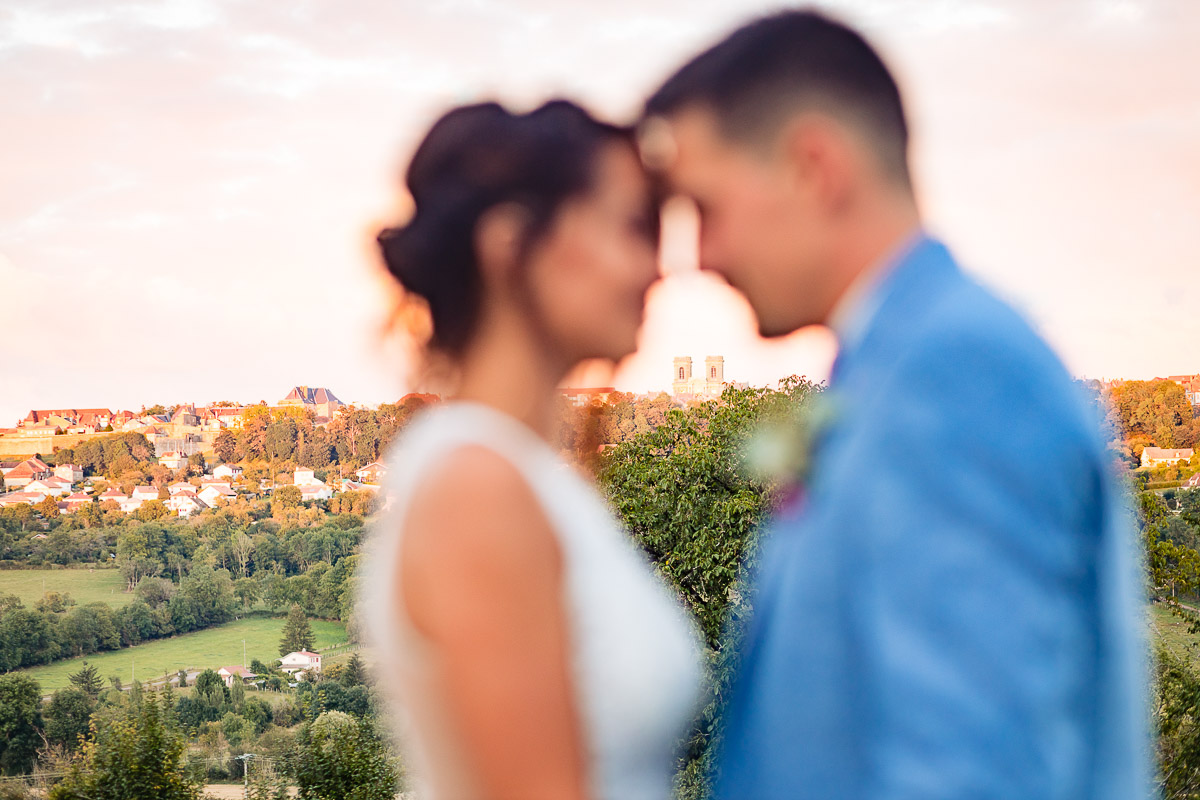 Ghislain a alors retrouvé Amélie chez eux pour un premier regard plein d’émotions avec vue sur la plaine lingonne. On est ensuite restés dans notre belle ville fortifiée pour la cérémonie civile à l’élégante mairie de Langres. Après l’union civile, l’adjoint au maire nous a donné l’accès au jardin du musée des Lumières pour des photos de couples de mariés canons dans un lieu canon.