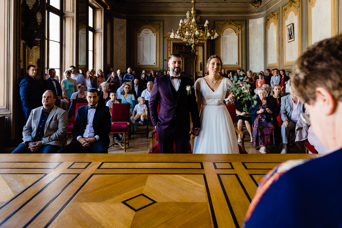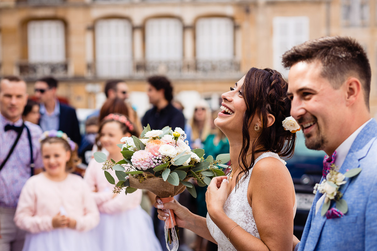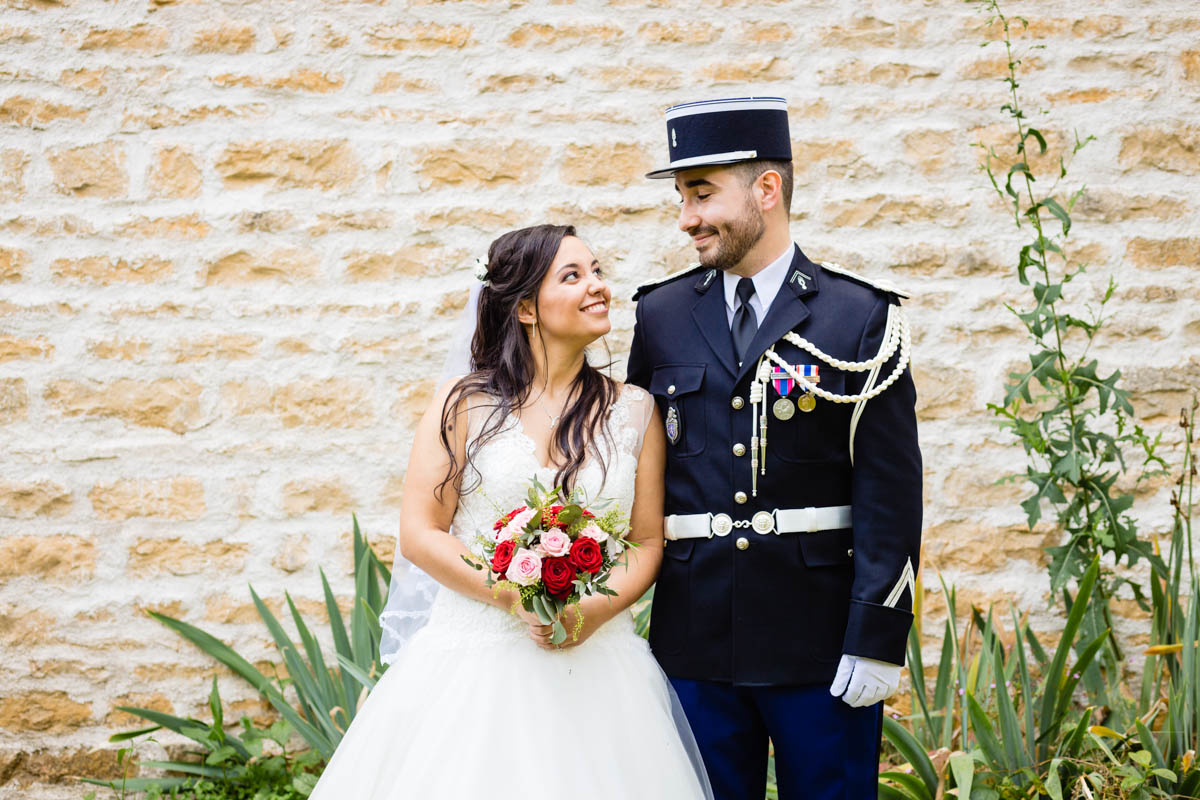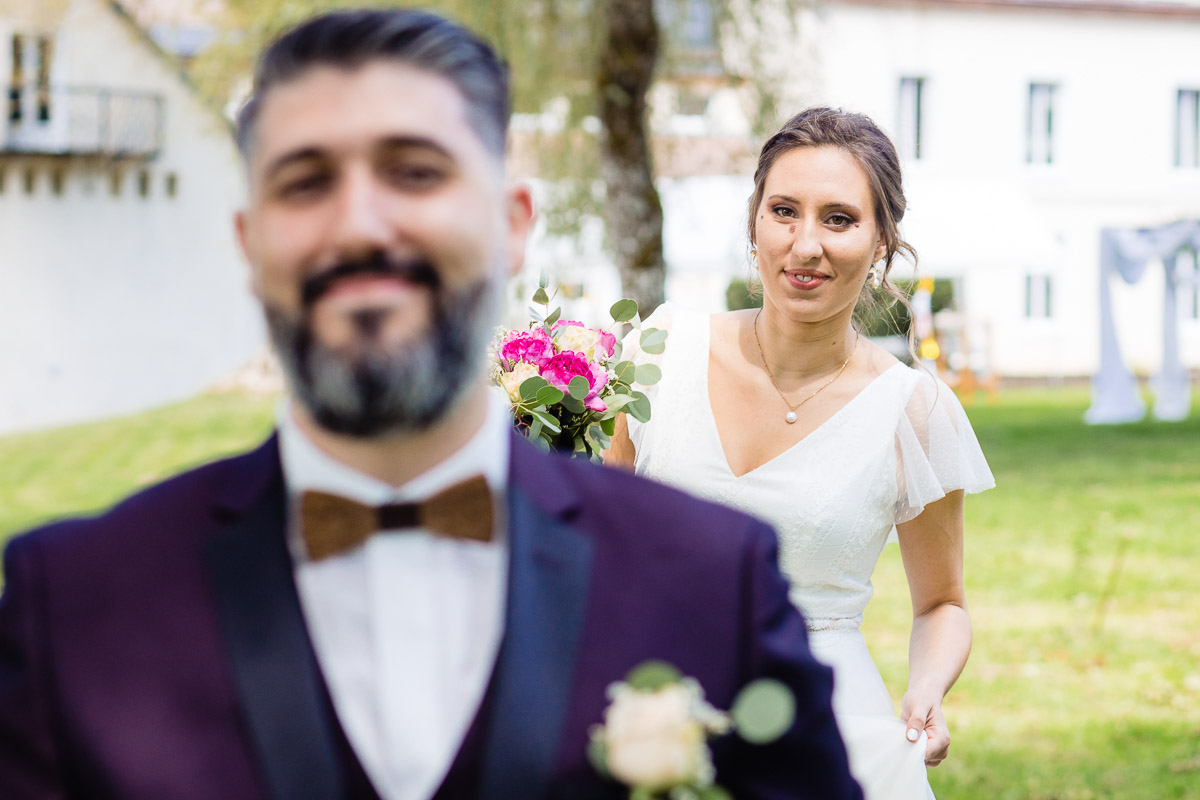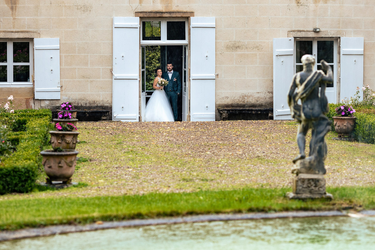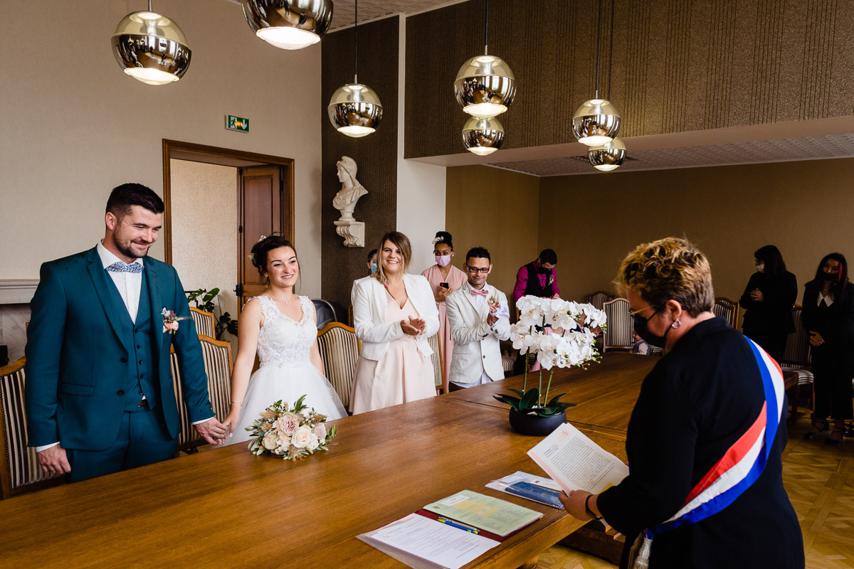 Ghislain a alors retrouvé Amélie chez eux pour un premier regard plein d’émotions avec vue sur la plaine lingonne. On est ensuite restés dans notre belle ville fortifiée pour la cérémonie civile à l’élégante mairie de Langres. Après l’union civile, l’adjoint au maire nous a donné l’accès au jardin du musée des Lumières pour des photos de couples de mariés canons dans un lieu canon.