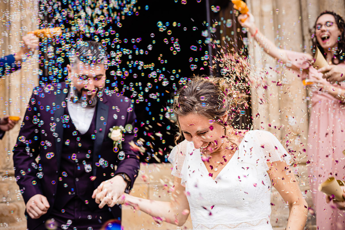 Le trajet s’est déroulé en 2CV colorée jusqu’à l’église de Chalindrey, où j’ai retrouvé le prêtre génial du mariage d’Océane et Clément. La sortie de l’église était épique, avec la surprise de la haie d’honneur de motos, un moment très émouvant pour Ghislain, motard lui-même (bravo à Louis pour l’orga !). Avant de se retrouver à la fameuse ferme Sainte-Anne, le cortège a fait un arrêt à l’iconique place Diderot, pour un concert de motos devant la statue éponyme.