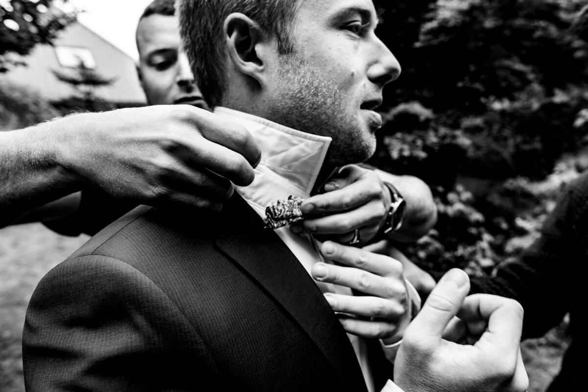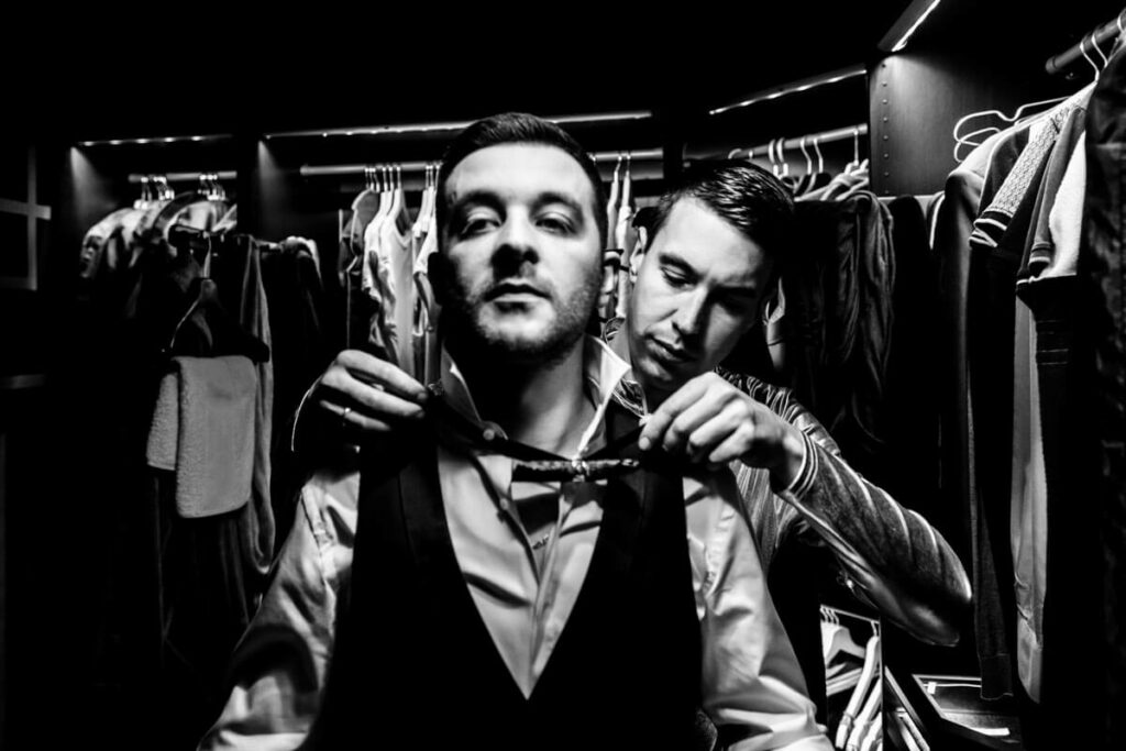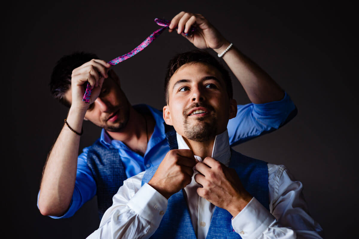 Si le planning en laisse le temps, et que vous n’avez pas dû à ce moment-là utiliser votre marge (spoiler alert : non, messieurs, vous habiller ne prend pas que cinq minutes), la fin des préparatifs peut être le moment de réaliser des portraits : de vous seul, ou avec vos témoins ou votre famille.